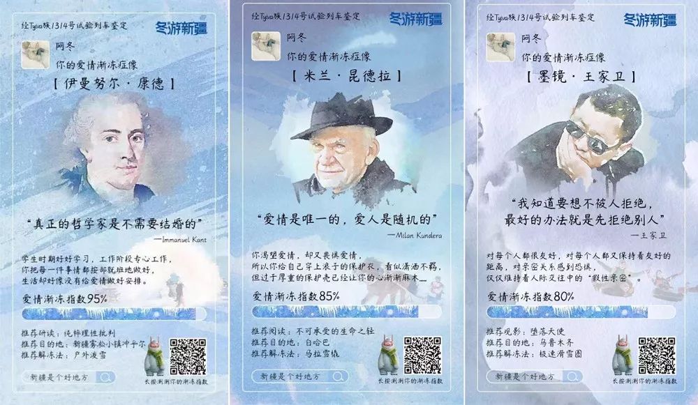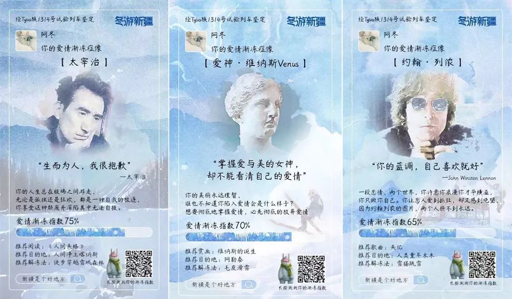 “爱情渐冻指数”测试H5,通过系列问题测试分出六类对应人物性格,有针对性的推荐新疆六个目的地和六种冰雪玩法。