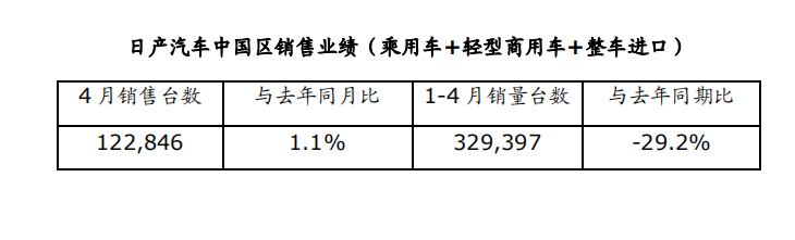 2020 年 1-4 月,日产汽车中国区累计销量为 329,397 辆,同比下降 29.2%。因 2 月引起的销量差距在 3 月、4 月逐步缩小。