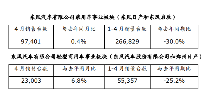 轻型商用车事业板块(包括东风汽车股份有限公司和郑州日产)4 月销量为 23,003 台, 同比增长 6.8%。