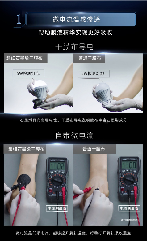 基于石墨烯技术研发的自然堂超细石墨烯膜布,因膜布中带有的石墨烯成分带有高导电性,可成功使灯泡等物体发光。