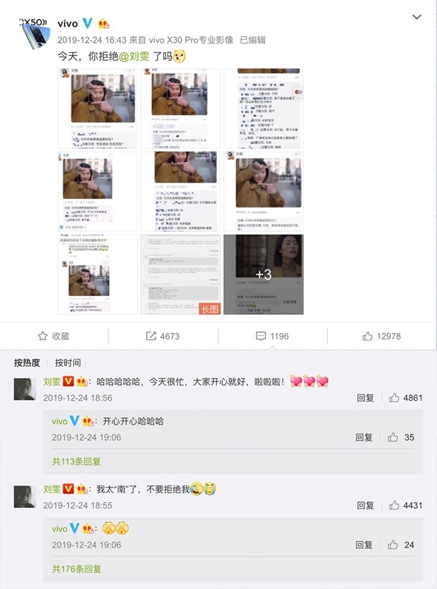 vivo收集趣味回复,并于官博发布“今天你拒绝刘雯了吗?”,联动娱乐大V持续发酵,实现朋友圈广告跨平台裂变传播,充分调动微博吃瓜群众的好奇心,网友纷纷主动搜索X30广告进行观看留言,同时vivo还有意识地将X30的功能点植入拒绝的声音中,如:“给我买一个60倍变焦的手机,我就答应你”、“买个vivo X30 我会考虑一下”等不断曝光产品卖点。