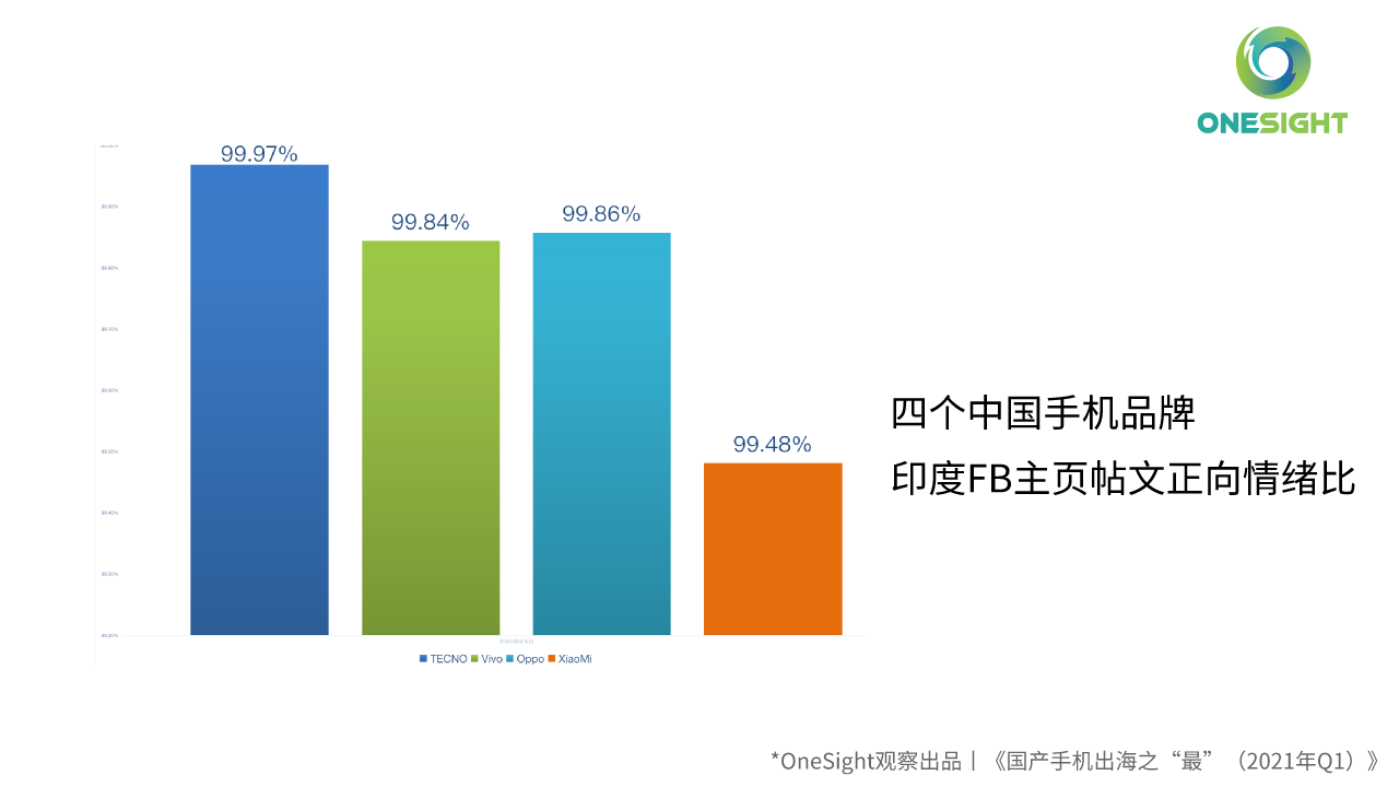 通过OneSight营销云“社交号监控”→“主页帖文心情数”分析功能,我们发现:2021Q1,小米、OPPO、vivo、TECNO在印度市场的FB主页的帖文反馈都很积极,正向情绪占比都超过了99%。