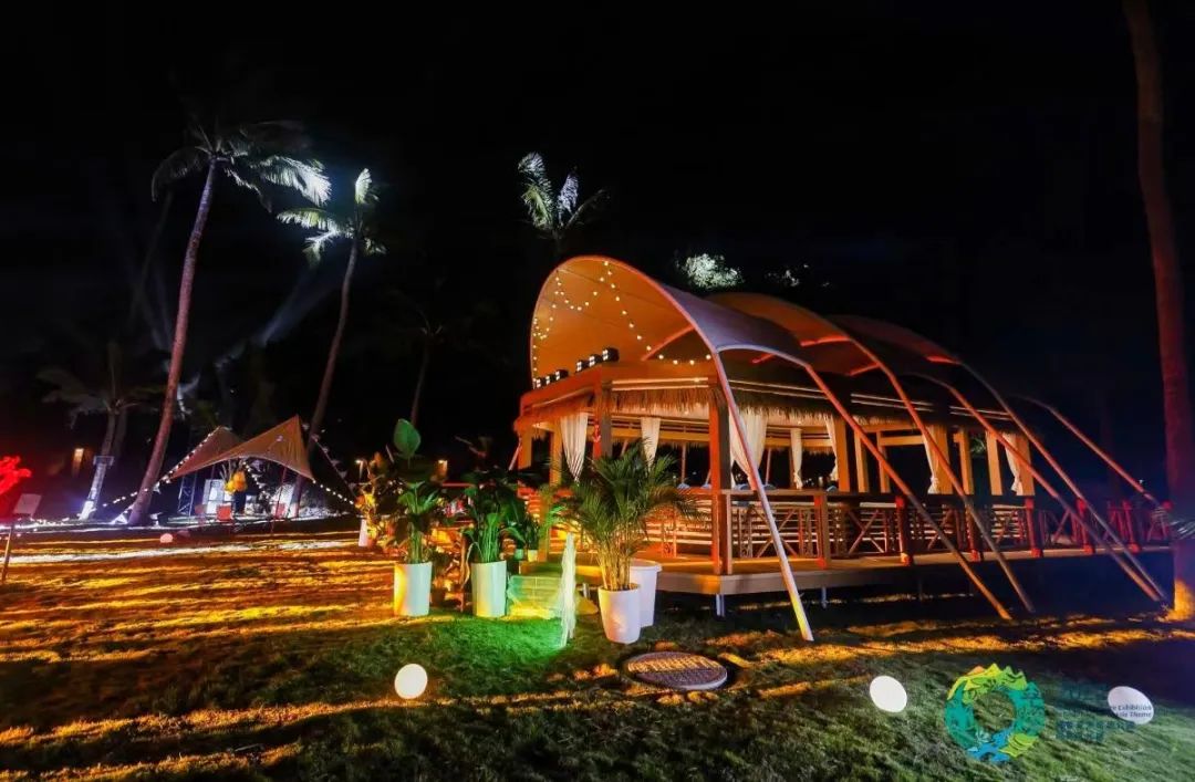 在听苑屋后的草坪上,有独具黎族古民居特色的开放式船型帐篷露营“打卡点”——“黎苗烟火 · 时之味”,提供各类饮品服务。