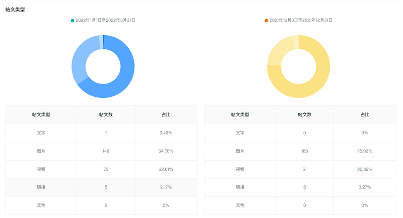两个季度周期内的帖文类型均以图片类帖文为主,这与服饰、美妆行业整体的内容类型相同。