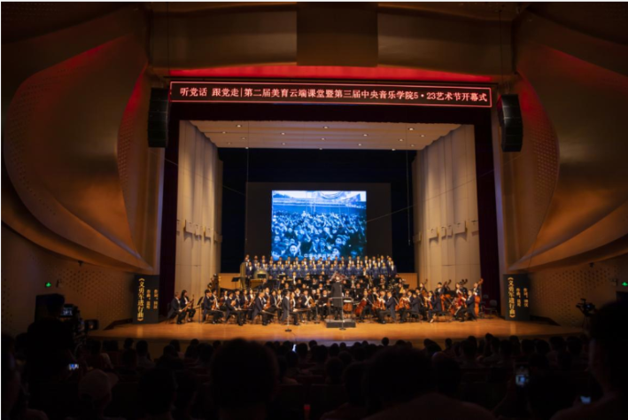 贯彻党的文艺方针,用美育传承延安精神。本场音乐会作为“音乐党史”系列活动首场进校园展演,拉开了第二届“青少年美育云端课堂”暨第三届中央音乐学院5.23艺术节的序幕。中央音乐学院俞峰院长以边讲边演的形式,辅以历史纪录片片段,指挥中央音乐学院交响乐团和合唱团及优秀歌唱家们倾情演绎了《长征组歌》《黄河大合唱》《我爱你中国》等十余首耳熟能详的红色音乐经典,讲解了音乐荡气回肠的党史故事,再现中国共产党波澜壮阔的奋斗史。每部作品演奏结束后,现场都响起经久不息的掌声。