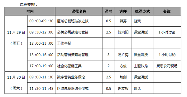 2013年首期“蒲公英区域总裁研修班”拟采用课堂讲授、课堂讨论和主题沙龙三种培训形式,就公司战略与营销、活动营销策略、数字营销业务以及社会化营销工具等4门课程有针对性地讲授和研讨,提升区域总裁们的战略思维、创新业务以及公司运营能力,培训总课时10小时。