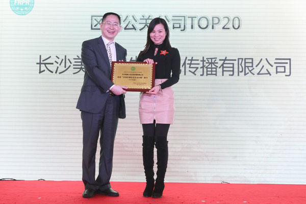 苏秦会创办人兼执行会长、联盟总顾问陈向阳为长沙美丽人生文化传播有限公司颁发“2013中国区域公关公司20强”奖牌。