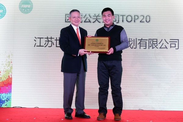 联盟顾问、互动通控股集团总裁邓广梼为江苏世通利方公关策划有限公司颁发“2013中国区域公关公司20强”奖牌。