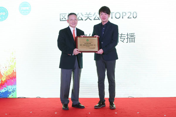 联盟顾问、互动通控股集团总裁邓广梼为天津三绅公关传播颁发“2013中国区域公关公司20强”奖牌。