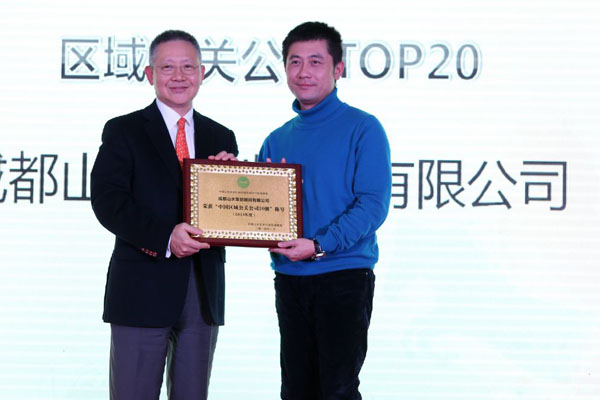 联盟顾问、互动通控股集团总裁邓广梼为成都山水策划顾问有限公司颁发“2013中国区域公关公司20强”奖牌。