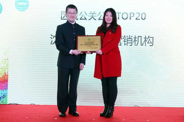 联盟顾问、杜邦北亚及澳新地区企业传播事务总监徐俊为沈阳韦伯宣雅营销机构颁发“2013中国区域公关公司20强”奖牌。