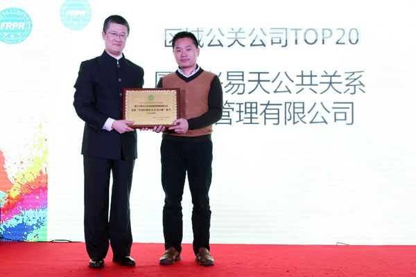 联盟顾问、杜邦北亚及澳新地区企业传播事务总监徐俊为厦门兴易天公共关系策划管理有限公司颁发“2013中国区域公关公司20强”奖牌。