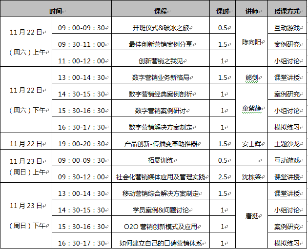 “创新营销高级研修班“第一期拟采用课堂讲授、案例剖析、小组讨论和模拟练习等授课方式,辅以实用而生动的主题沙龙、拓展训练、价值分享等团队激励,培训总课时16.5小时。
