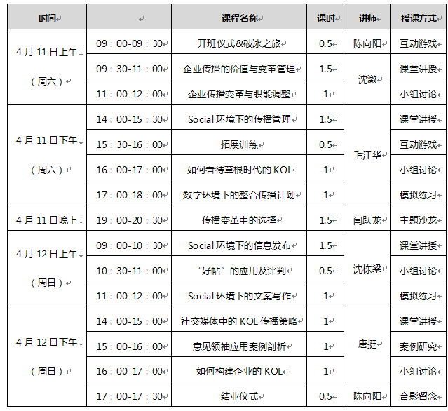 “战略传播高级研修班“第一期拟采用课堂讲授、小组讨论、案例研究和模拟练习等授课方式,辅以实用而生动的主题沙龙、拓展训练、互动游戏等团队激励,培训总课时15.5小时。