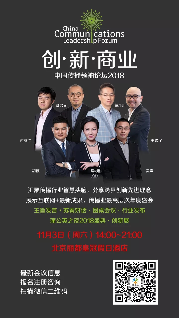 汇聚传播行业智慧头脑,分享跨界创新先进理念,展示互联网+最新成果,传播业最高层次年度盛会——第七届中国传播领袖论坛暨蒲公英之夜2018盛典于11月3日在北京丽都皇冠假日酒店举办。