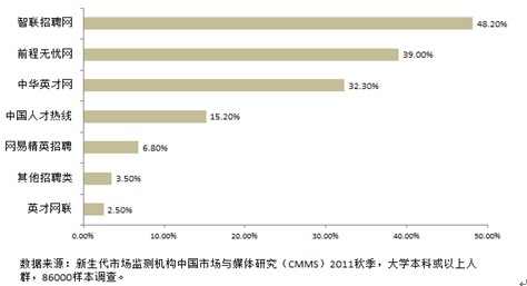 新生代报告最新数据结果显示, 2011 年中国网络招聘的市场规模就突破 44 亿元, 2012 年将达 56 亿元,年复合增长率在 22%-26% 左右。传统行业巨头智联招聘、前程无忧、中华英才网等市场份额合计达到市场总份额的 72.3% ,远超其他网络招聘机构。
