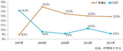 同时,中国广告与GDP基本保持一致。2012年GDP预期低于2011年,因此中国广告市场的2012年涨幅预计将在11%,甚至更低。