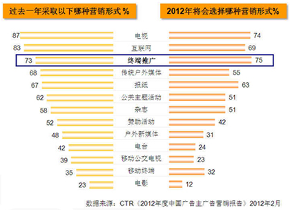 CTR媒介智讯最新的广告主研究显示,终端推广,这一原始但较容易形成创意推广的方式,成为此次调查中唯一选择率增加的方式。