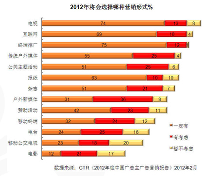 电视、移动公交电视、传统户外等选择率都出现了下降,甚至互联网的选择率也略有下降,而报纸、移动终端的选择相对稳定。这种与以往差异较大的结果,也从一个侧面反映国内企业对2012年广告环境的不确定。