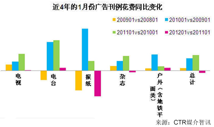 当我们讨论着2011年的平稳发展时,2012年1月的数据已经残酷的摆在了面前。传统广告的刊例花费同比下降3%,报纸同比37%的降幅严重拉低了整体水平。