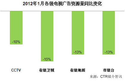 电视广告增长基本与去年同期持平,省级卫视和省级地面品牌的刊例花费同期涨幅略高于其他级别。而电视的广告资源量在新一轮的政策调整后,广告空间进一步大幅缩减,CCTV的调整幅度最小,但也有近10%的降幅。 广电总局各种限令对传统媒体的累积影响效应会在2012年表现得更为严重 。