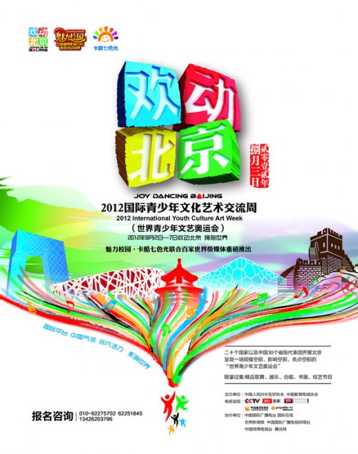 欢乐舞动北京,青春拥抱世界。2012年8月2日-7日,“欢动北京”2012国际青少年文化艺术交流周将在中国北京盛大举行。届时,全球将有超过20个国家以及中国30个省级代表团的青少年欢聚北京,带来代表本国、本民族、本地区的特色文艺节目及交流项目,呈现一场规模空前、亮点空前、影响空前的“世界青少年文艺奥运会”。