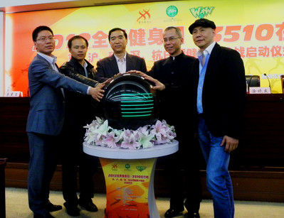 2012“WOW男WOW女”健康活动启动仪式:(从右到左)触动传媒创始人及行政主席冯晖中,中国体育报业总社社长涂晓东,国家体育总局群体司司长盛志国,共青团北京市委员会社会工作部部长龚波,人民日报健康时报总编辑助理李晨玉
