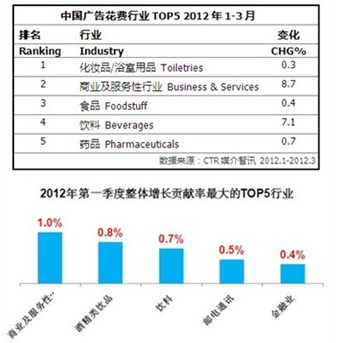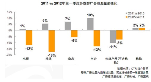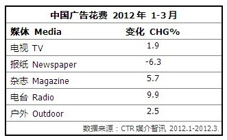 CTR近日发布了2012年第一季度中国传统媒体广告花费的数据图表报告。报告显示,中国市场传统媒体刊例广告在第一季度同比增长仅为1.4 %,创近五年来的新低。