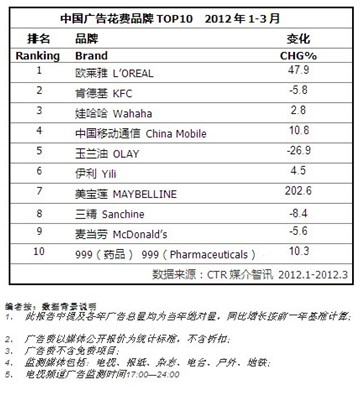 第一季度,欧莱雅在传统媒体广告市场份额增幅达47.9%,逐渐追上宝洁,成为广告花费第一的品牌;美宝莲广告投放额增幅高达202.6%;基于成本压力和竞争激烈等因素,肯德基和麦当劳均呈下滑态势,分别为5.8%和5.6%。