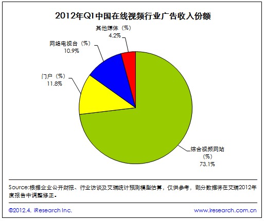 2011年第三季度综合视频网站的广告收入一跃上升至70%以上,2012年继续保持优势,第一季度上升至73.1%。2012年优酷网与土豆网的牵手引领了视频行业合作共赢的趋势,在综合视频两大网站联营之后,综合视频网站的媒体价值将进一步上升,未来可能会提高综合视频网站的广告单价而获得更高的收益,艾瑞预计,综合视频网站的广告收入将会稳步上升,门户网站与网络电视台由于从业企业较少,广告收入份额将趋于稳定。