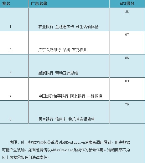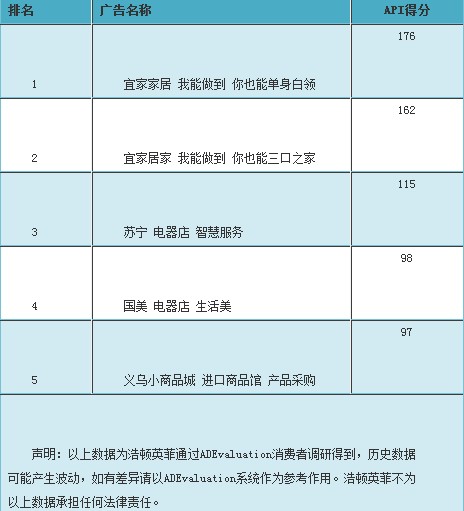 浩顿英菲以先进的广告优化研究模型Ameritest为研究基础,搭建电视广告效果监测平台ADEvaluation,用消费者的观点为广告把脉,用科学的研究手段来为广告把关,带来2012年3月份新投放电视广告效果评估榜单。