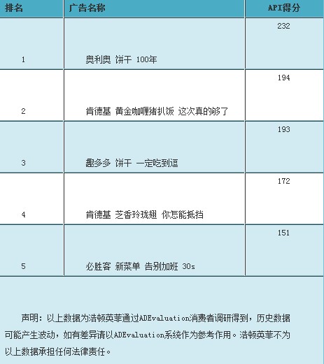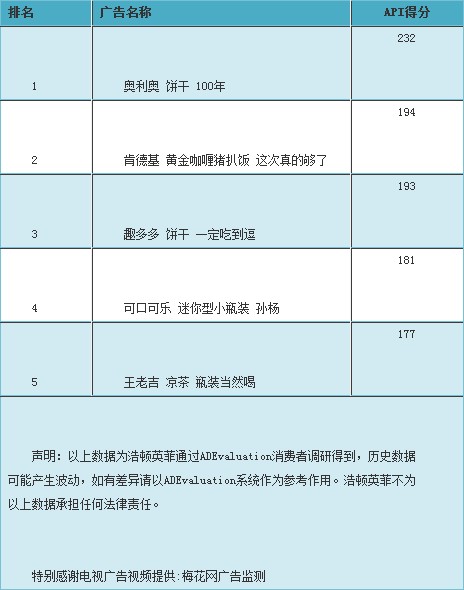 浩顿英菲ADEvaluation最新数据显示,3月食品类电视广告表现抢眼,在总排行榜Top3的广告全部为食品类广告。而食品类单项行业排名,可以看到分属于卡夫(奥利奥,趣多多)和百胜餐饮(肯德基,必胜客)占据了榜单前5名。