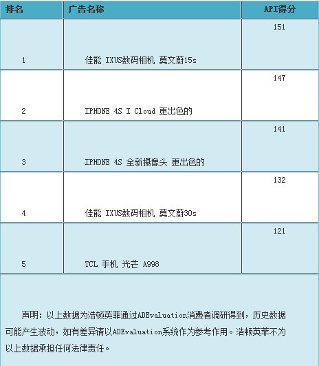 无论是佳能IXUS系列坚持选择莫文蔚代言,还是苹果坚持不让明星代言,在3月数码类广告效果的对决中,结果还是难分伯仲。不过IXUS的15秒版本效果更胜于30秒版本,倒是可以帮助佳能修改广告投放策略,而IPHONE 4S不同创意的两则广告差别不大,仍然可以继续平行投放。