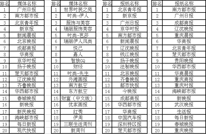 2012年4月份报纸杂志广告投放排名数据出炉,下图从左至右分别为:04月杂志广告投放TOP20、04月汽车行业TOP20报纸、04月汽车行业TOP20报纸、04月房地产行业TOP20报纸。