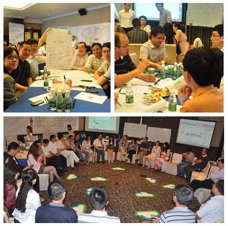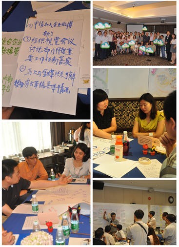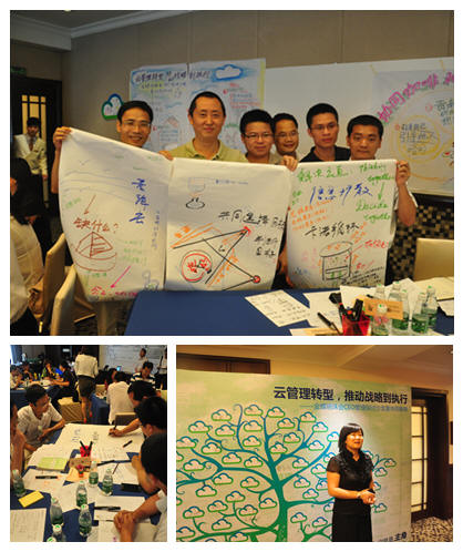 在进行深度汇谈时,组委会别出心裁地设置了“蝴蝶飞,传花粉”环节,将小组成员不断打散重组,交换、分享与传播不同角度、不同心境的想法。同时,会议现场的金蝶微博墙及时公布各个小组的讨论成果,增进小组之间信息的传递,也为会后的交流提供了优质的平台。 深度剖析环节之后,两位嘉宾引导大家将话题聚焦于与自己工作息息相关的内容上,畅想在云管理时代CEO如何利用IT工具让自己的工作更高效。通过大家的讨论结果,可以看到一个共同点:高效的CEO需要让企业具备卓越的战略执行体系,而卓越的战略执行体系,离不开创新思维、协同思维、以及开放分享的企业文化。