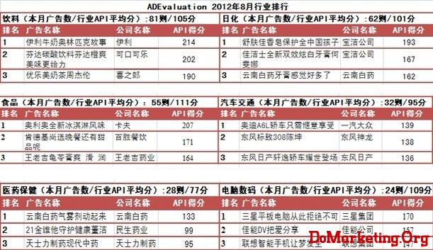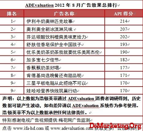 而从广告效果来看,8月广告效果排名,伊利牛奶奥林匹克故事广告API得分214,位居8月电视广告效果评估排行榜榜首。在Top10广告排行中,饮料类广告占据了60.0%的份额,表现强劲。此外四则属于食品、日化、电脑数码类广告,而医药保健、汽车交通、家用电器、服装服饰、零售服务、婴幼儿、金融广告整体表现偏弱。纵观8月排行,大陆品牌占据5席,而且都是饮料类广告,伊利、优乐美、加多宝、香飘飘、娃哈哈榜上有名;欧美品牌占据4席(食品、饮料、日化);日韩品牌占据1席(电脑数码),可见大陆的饮料品牌有崛起之势。