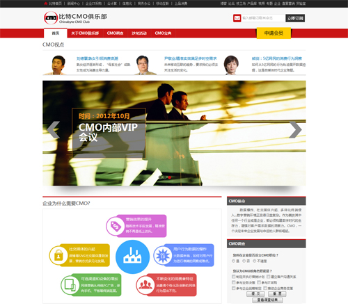 比特CMO俱乐部官网(http://cmo.chinabyte.com)内容精彩纷呈,设置了CMO使命、CMO资讯、CMO视点、CMO宝典(CMO相关课程及实践)、俱乐部成员展示、线下沙龙、官方微博、营销行业解决方案八大板块,力求为广大CMO群体呈送一道精美而丰富的专业大餐。