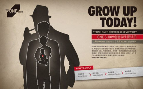 2013年6月2日,Young Ones Portfolio Review Day 创意青年面试日正式登陆中国。15间著名国际创意公司的高层创意人及近百位创意青年集聚上海8号桥创意产业园,开始了一场关于年轻人创意教育以及职业生涯发展的交流与探讨。而美国One Show创意节的主办机构The One Club则在美国开展这一非营利教育项目已经超过20年,是全球最关注年轻创意人成长的机构。