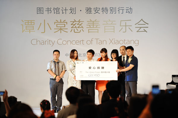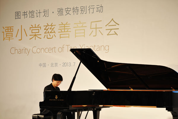 2013年7月20日,正值雅安地震百日, 图书馆计划雅安特别行动—谭小棠慈善音乐会在北京柏悦酒店深情奏响。此次音乐会由国际公益组织“图书馆计划”,联合中国人口福利基金会、中国国际公共关系协会、北京柏悦酒店,携手青年钢琴家谭小棠爱心义演,为雅安地区小学图书馆重建募集善款。