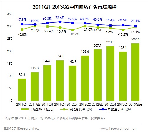 2013Q2中国网络广告市场规模达到232.6亿元,达到新高峰。