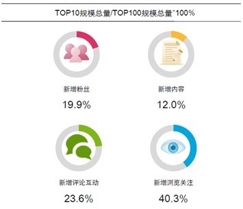 若以TOP10代表行业领先,TOP100代表整个行业,通过四项指标对比发现:TOP10的行业领跑品牌包揽了TOP100中40.34%的浏览关注增量,23.55%的评论互动增量,19.88%的粉丝增量和11.95%的内容增量。相对TOP100品牌来说,TOP10品牌的浏览关注规模与评论互动规模,明显高于其他规模指标。