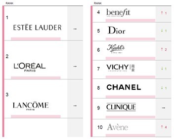 雅诗兰黛、巴黎欧莱雅和兰蔻仍然稳坐头三把交椅