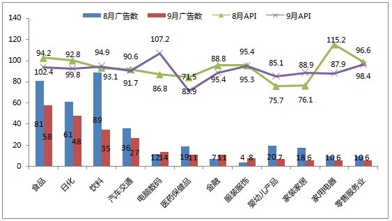 广告效果API情况,从广告分类来看,本月API普遍不高,电脑数码广告成为本月API最高,也仅达到107.2分。其次零售服务业(96.6分)和服装服饰(95.4分)分别排名第二、三位,而饮料(94.9分)、食品(94.2分)、日化(92.8分)这些品类的广告的API并没有取得很好的成绩。