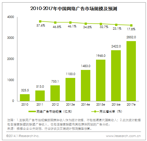 根据艾瑞咨询发布的2013年度中国网络广告核心数据,2013年国内网络广告市场规模达到1100亿元,同比增长46.1%,与去年保持相当的增长速度,整体保持平稳增长。在网络广告高速发展几年之后,网络媒体的营销价值已经得到广告主的较高认可。艾瑞分析认为,国内网络广告市场规模在突破千亿大关之后,随着市场的成熟度不断提高,将在未来几年放缓增速,平稳发展。