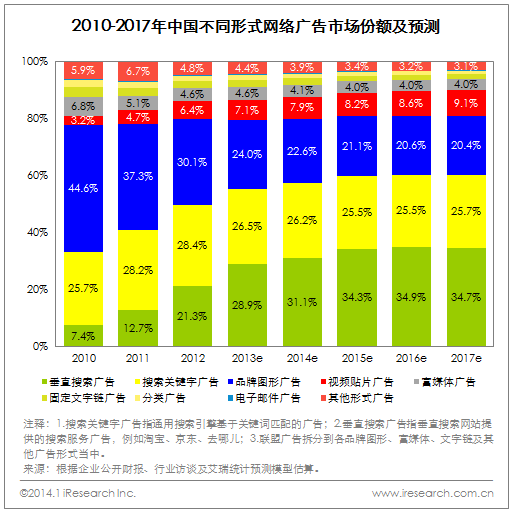 2013年,垂直搜索广告增长明显,占比达28.9%,超越搜索关键字广告,成为占比最大的网络广告形式;视频贴片广告占比进一步上升,占比达7.1%。品牌图形广告与搜索关键字广告作为传统网络广告形式,占比相对受到挤压。