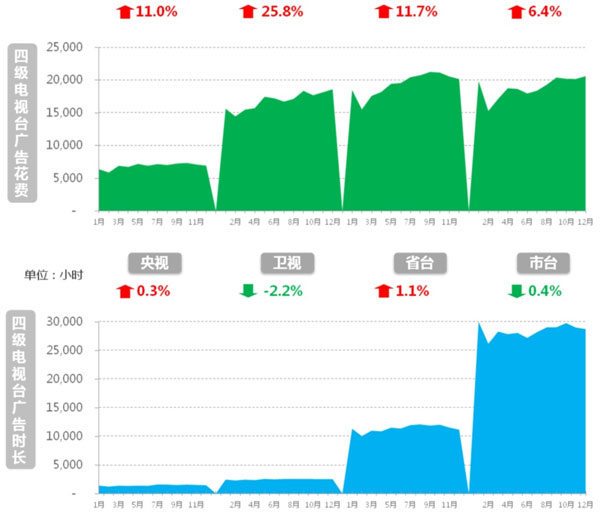 图五:四级电视媒体集团的广告花费和广告时长同比增长趋势