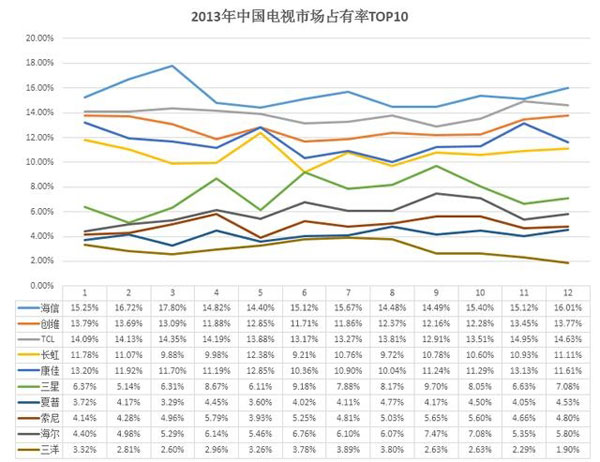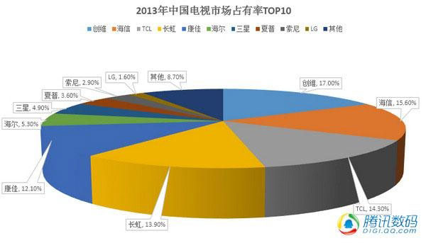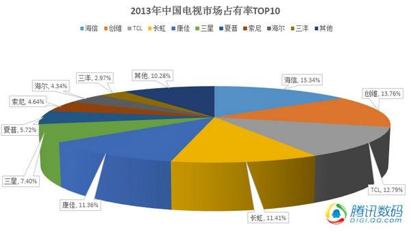 奥维咨询的报告指出,2013年中国电视市场零售总量为4781万台,同比增长12.7%,2013年中国电视市场占有率TOP10品牌为创维、海信、TCL、长虹、康佳、海尔、三星、夏普、索尼和LG,其中前六均为国产品品牌。从市占率来看,前五名处于同一阵营,市场份额相差不大,创维、海信、TCL、长虹、康佳份额分别为16.7%、15%、16.1%、15.6%和14.3%,其余品牌则均不超过10%,竞争力稍弱,而2013年声量较大的互联网品牌如小米、乐视均未上榜。