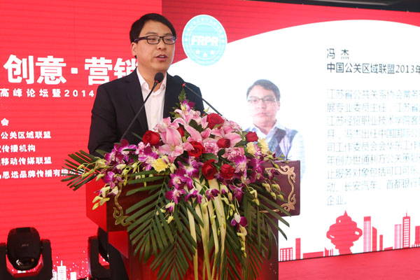 联盟2013年度主席、世通利方传播集团董事长冯杰先生在致辞中指出,中国公关区域联盟在陈向阳总顾问的指导下,经过短短20个月的发展,已扩展到全国18个省域区域市场,此次高峰论坛暨青岛年会,特别是联盟一届理事会四次会议的顺利召开,将为中国公共关系区域市场的健康发展奠定坚实的基础,区域市场的发展和繁荣有赖于在区域公司的职业化、专业化和规范化,更有赖于众多区域公司主要负责人建立广泛共识,采取一致行动。他呼吁更多区域公司加入联盟,共同推动中国公关区域市场的可持续健康发展,为联盟和区域发展带来新的活力。