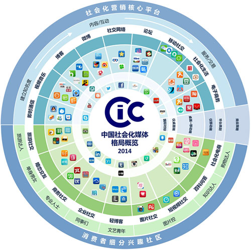 格局图被划分为上下两大部分,分别是“社会化营销核心平台”和“消费者细分兴趣社区”,而从内圈到外圈分别是该类平台的国际对标、平台跨屏分布情况、平台类别以及营销者在该类平台上建议采用的商业策略。