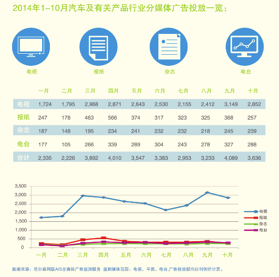 从月份投放额来看,在1-10月中,4月和9月的广告投放出现高峰,1月、2月、7月三个月为投放的低谷。而从不同媒体形态的广告投放分配来看,电视媒体是汽车企业首选的投放媒体,占据每月广告投放的绝对比重,报纸、杂志和电台媒体占比平均,都在汽车企业月度广告投放中占据一席之地。